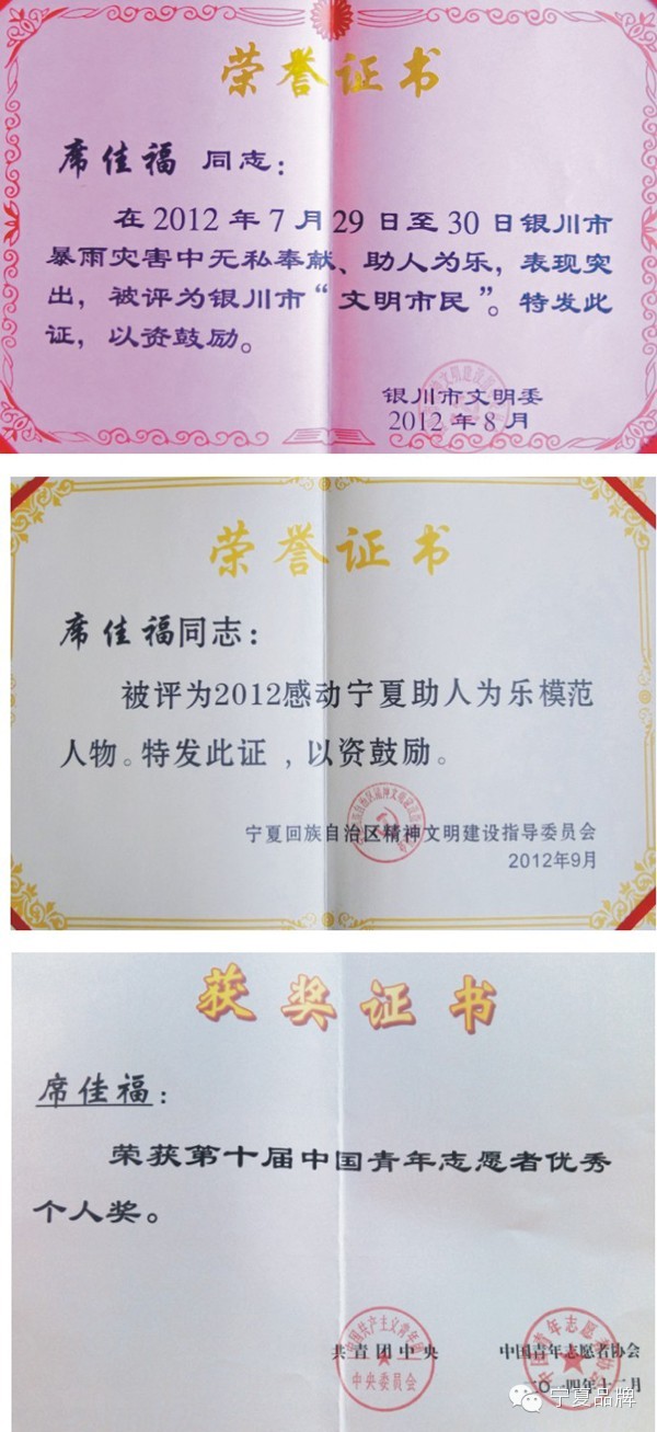 近年来,席佳福积极组织和参与社会公益慈善活动,充分发挥一名志愿者的模范带头作用,受到了宁夏区市级的多次表彰和鼓励:2012年荣获银川市文明办授予银川市“文明市民”荣誉、宁夏自治区文明办“2012感动宁夏助人为乐模范人物”荣誉;2013年荣获中国顺风车(联盟)公益基金管委会“优秀绿丝带志愿者”荣誉;在宁夏党委宣传部主办的“感动宁夏•2012年度人物评选”颁奖盛典,荣获“银川市7.29助人为乐群体--年度集体奖”荣誉表彰;宁夏首届微盛典(微博盘点暨微STAR评选) 荣获“年度慈善人物”荣誉;2014年银川市委宣传部主办的“网聚真善美•传递正能量”荣获“2013年度网络公益先进个人”荣誉;由宁夏党委宣传部主办的“凝聚正能量•共筑中国梦”2013宁夏网络文化系列活动“十佳正能量之星个人微博”荣誉;3月5日荣获自治区党委宣传部等部门联合举办的第二届“鲜花朵朵送雷锋”大型公益活动被推荐为“身边的雷锋”荣誉表彰;5月5日荣获共青团宁夏回族自治区委员会、宁夏人力资源和社会保障厅、宁夏自治区文明办、宁夏志愿者协会联合举办的第三届“自治区优秀志愿者”荣誉表彰;12月8日荣获共青团中央委员会、中国志愿者协会联合举办的第十届“中国青年优秀志愿者个人奖”荣誉表彰。